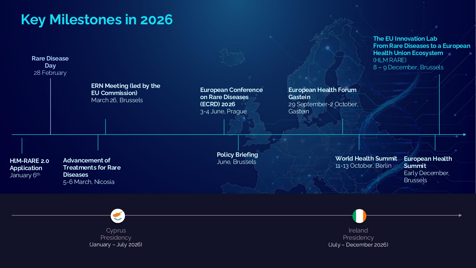 The timeline shown highlights key political, policy, and scientific milestones in 2026, during which rare diseases will be firmly on the agenda. These include major EU-level meetings, international conferences, policy briefings, and the continuation of the EU Innovation Lab: From Rare Diseases to a European Health Union Ecosystem, culminating in further high-level discussions later in the year.
